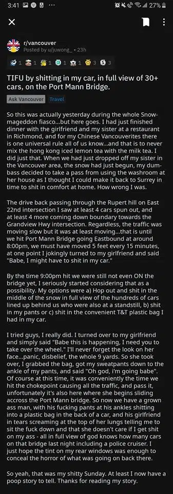 The story from juwong_ on Reddit tells the tale of what happens when you gotta go number two, but you’re stuck in non-moving traffic on the Port Mann…