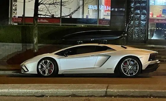 Peak Vancouver: Lambo with ski box parked in front of a Timmies